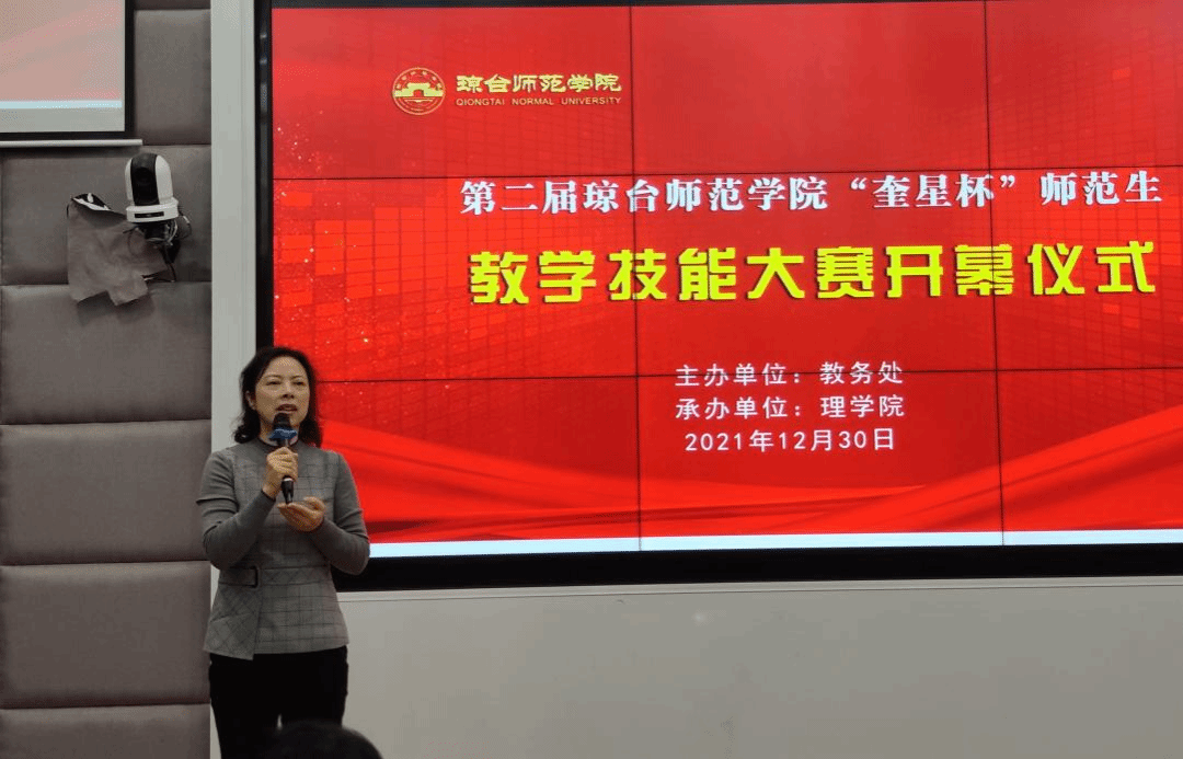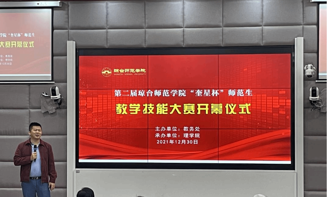 为进一步巩固提高师范教育专业实习生教学技能,激发学生更新教育教学理念和掌握现代教学方法,促进实习反思,借教育实习工作总结阶段契机,2021年12月30日,由琼台师范学院教务处主办,理学院承办的第二届琼台师范学院“奎星杯”师范生教学技能大赛,在我校桂林洋校区实验楼举行。