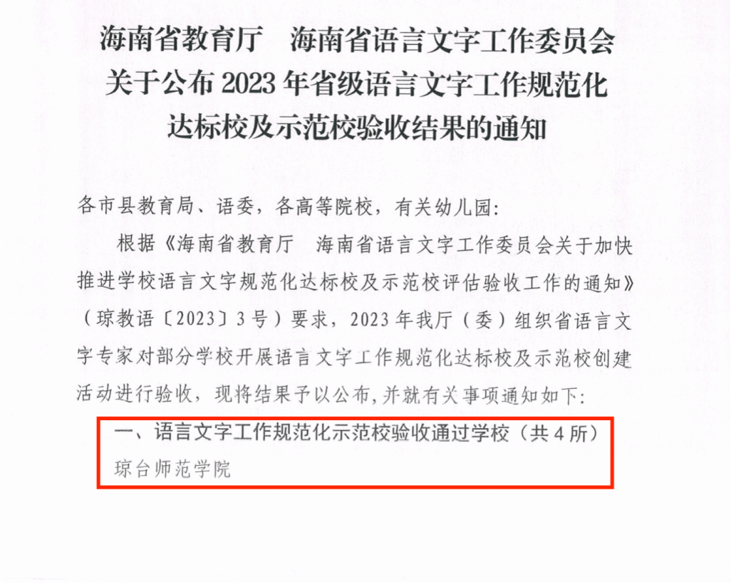 近日,海南省教育厅、海南省语言文字工作委员会公布2023年省级语言文字工作规范化达标校及示范校验收结果,我校顺利通过验收并获批2023年海南省语言文字规范化示范校。