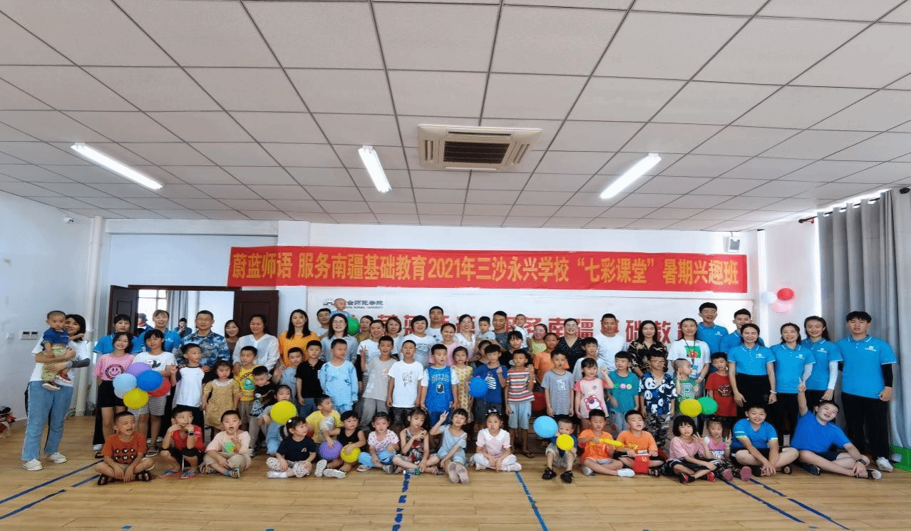 蔚蓝师语,服务南疆基础教育”志愿服务实践团队(以下简称“蔚蓝师语”)是琼台师范学院着力打造的优秀志愿服务品牌,旨在满足永兴岛上驻岛军民子女的托管服务和提升综合素质需求。项目自2018 年组建至今已顺利开办 4 期,4 年来,蔚蓝师语支教团队共计派出 40 余名志愿者和 10 名指导教师,围绕“赓续红色基因、扎根绿色大地、驻守蓝色海洋”三个主题,开设有舞蹈、美术、朗诵、手工、绘画、音乐等多种特色艺术课程,累计服务 290 余人次。学生们的年龄跨度从 3 岁到 13 岁不等,教学对象来源多元化,支教团队以理想信念教育养成和课外兴趣培养为主实施混龄教育,以润物细无声的方式寓教于乐。